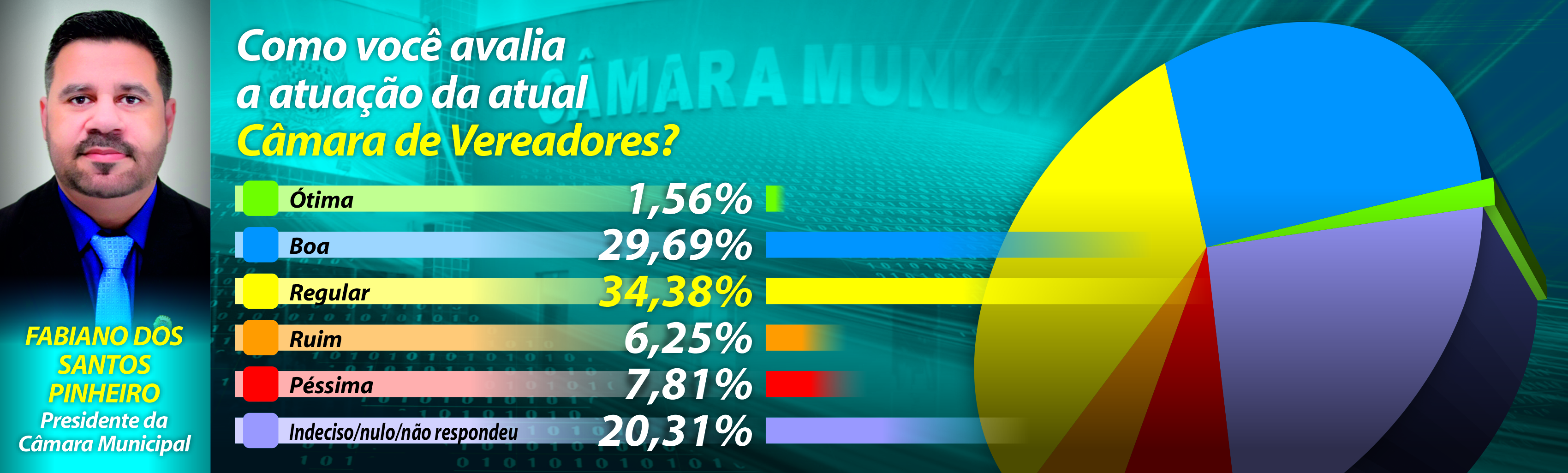 No tocante à atuação do Legislativo Municipal, conjuntamente, apurou-se que a maioria afirma ser ‘regular’. Essa opção foi a escolhida por 34,38% dos entrevistados; aprovam os trabalhos da Câmara 31,25%, enquanto que outros 14,06% reprovam.