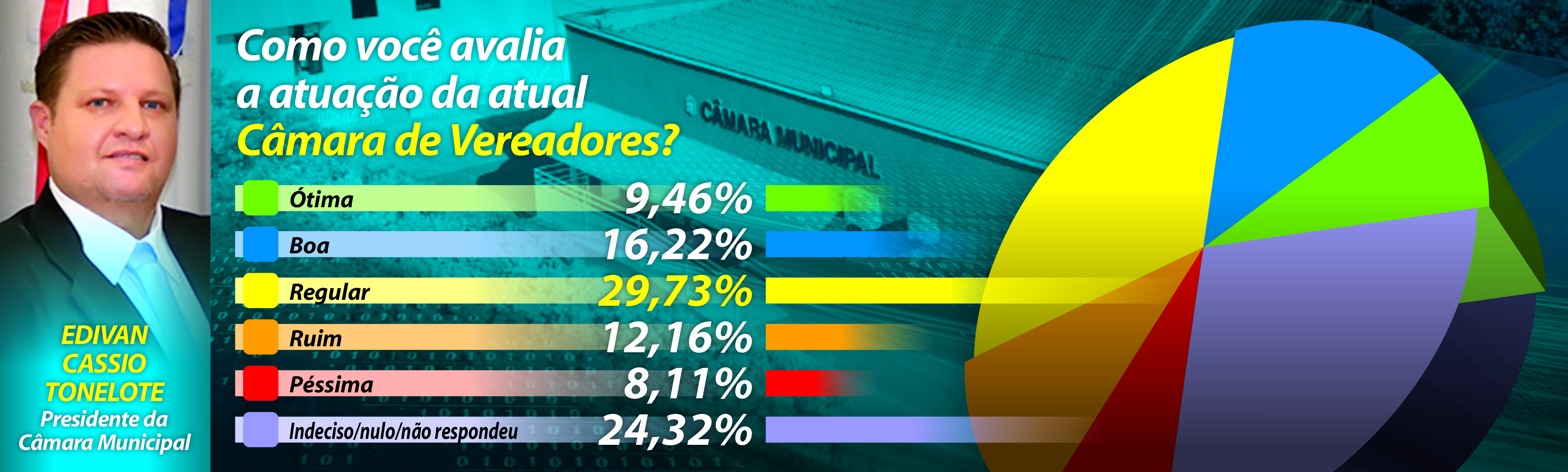 No tocante à atuação do Legislativo Municipal, conjuntamente, há a prevalência da avaliação popular de que os trabalhos são ‘regulares’. Escolheram essa opção 29,73% dos entrevistados. Reprovam-nos 20,27% (12,16% de ‘ruim’ e 8,11% de ‘péssima’) dos entrevistados e aprovam-nos 25,68% (frutos de 9,46% de avalições ‘ótimas’ e de 16,22% de ‘boas’).