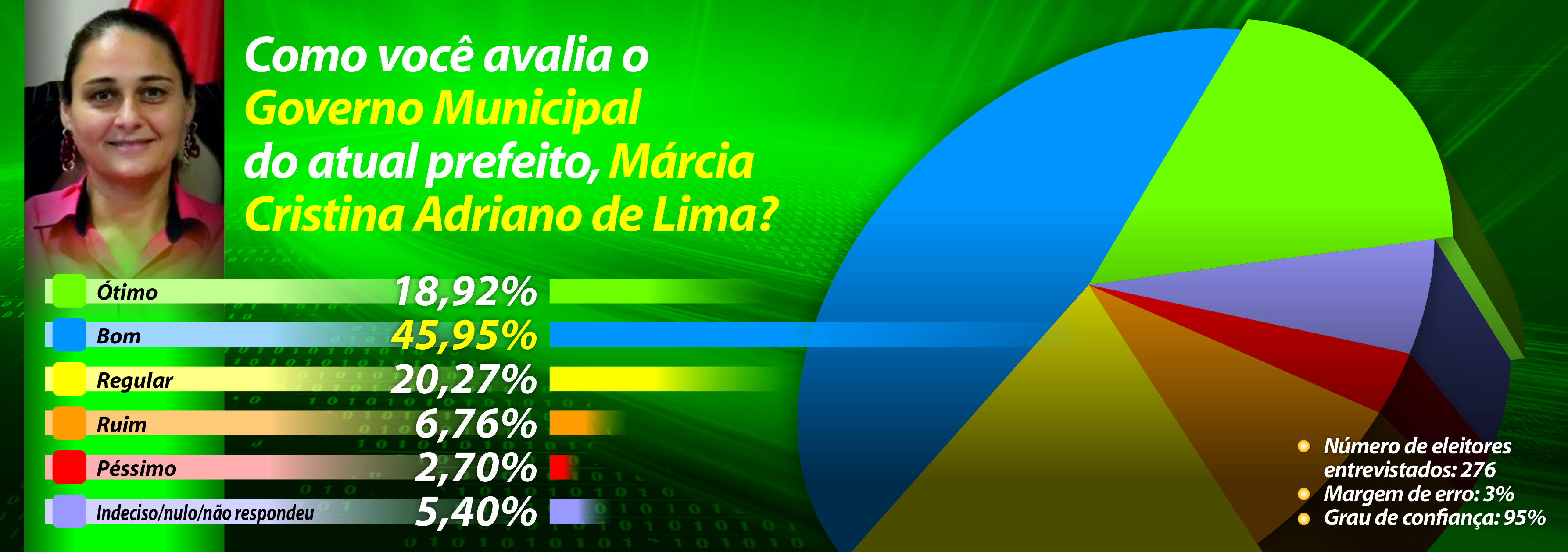 O primeiro ano da gestão da prefeita de Meridiano Márcia Cristina Adriano de Lima (Avante) tem a aprovação de 64,87% dos 276 eleitores entrevistados em pesquisa de opinião pública realizada no último dia 04, subdivididos, proporcionalmente, dentre os residentes na sede do município e no distrito de Santo Antônio. Esse índice provém de 18,92% dos respondentes que classificam a atual administração municipal como ‘ótima’, somados aos 45,95% que a classificam como ‘boa’. Por outro lado, 6,76% afirmaram ser ‘ruim’ e outros 2,70% como ‘péssima’, perfazendo índice de reprovação de 9,46%. No intermédio estão 20,27% que a adjetivam como ‘regular’.
