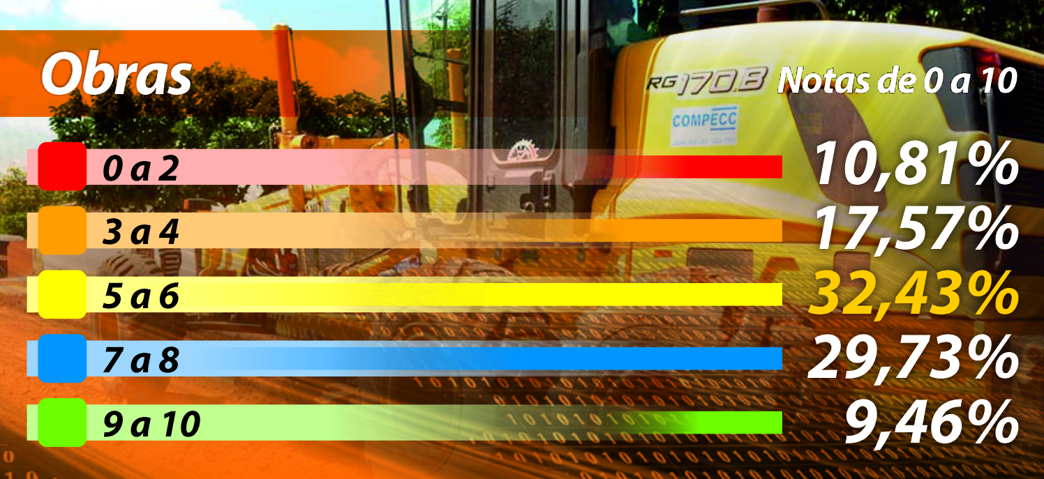 Na segmentação setorial das ações do Executivo Municipal tem-se como destaques as avalições positivas da Saúde, com 56% de notas máximas (9 ou 10); da Educação com 52% e das ações de combate à pandemia de Covid-19 que contam com o respaldo de 62% dos respondentes. Por outro lado, deixam a desejar, segundos os entrevistados, os setores de Habitação com 13% de notas máximas; de Obras com 9%; a conservação das Estradas Rurais com 10% e o Esporte com 12%. Confira nos gráficos todos os detalhes da pesquisa administrativa.