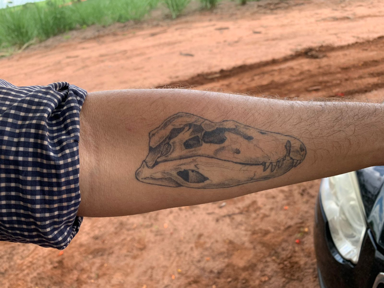 NA PELE: Um aluno de doutorado que participou da expedição em Jales e Fernandópolis gosta tanto do crocodilo pré-histórico encontrado na região que até tatuou a imagem do crânio dele no braço