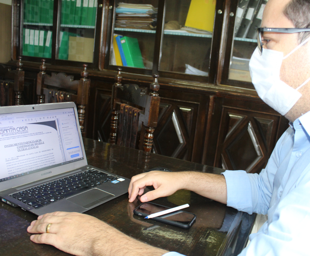 Duro golpe nas finanças: “Confissão de dívida gera uma ação ganha para quem cobra, e é certeza de prejuízo para a Santa Casa”, enfatiza Dr. Fernando Lucas de Lima, advogado do hospital, enquanto analisa um dos documentos de “Instrumento Particular de Confissão de Dívida e outras avenças”