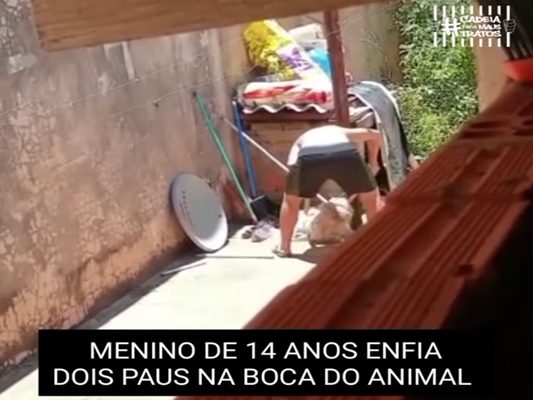 Nas imagens é possível visualizar quando o adolescente golpeia o animal com um pedaço de madeira.