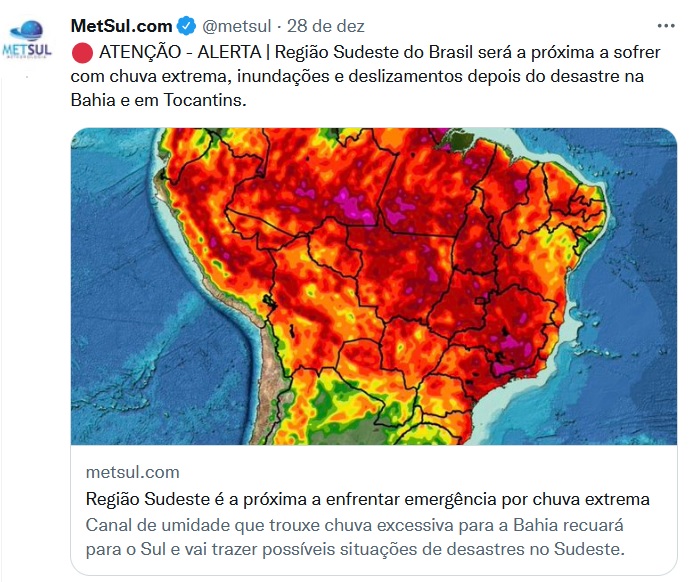 Uma situação de desastre por chuva que era antecipada e foi ostensivamente alertada. Em boletim publicado em 21 de dezembro, intitulado “Brasil pode ter novos desastres por chuva excessiva nesta virada de ano”, a MetSul ressaltava que Tocantins e Bahia registrariam volumes excepcionalmente altos e enfatizava, no caso da Bahia, que “com o solo saturado de umidade pelo recente episódio de precipitação extrema, rios com níveis ainda acima da média e muitas pessoas que ainda sofrem os efeitos do desastre do começo de dezembro, o cenário que se esboça é muito preocupante”.