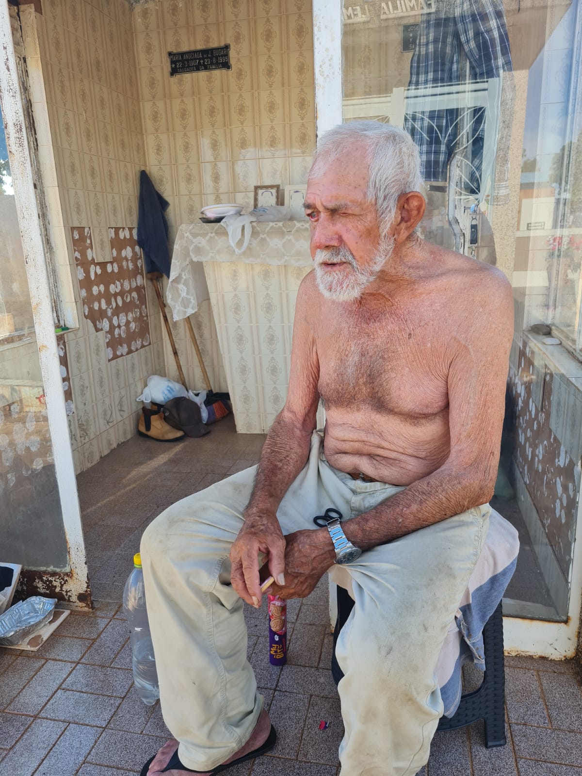 O idoso chegou a morar no asilo, porém, não quer voltar para o local. “Deus me livre, aquilo (asilo) é para o cara que está morrendo”, ressalta Valdemar, que, atualmente, “mora” em uma sepultura (tipo ‘casinha’) da família Bugari.