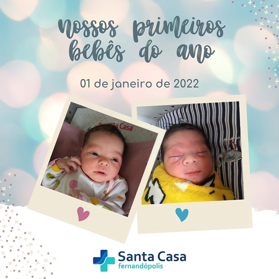 Os primeiros bebês de 2022 em Fernandópolis nasceram às 9h25 e às 10h, do dia 1º de janeiro. Em nota, por meio das redes sociais, a Santa Casa local deu as boas-vindas aos pequenos.