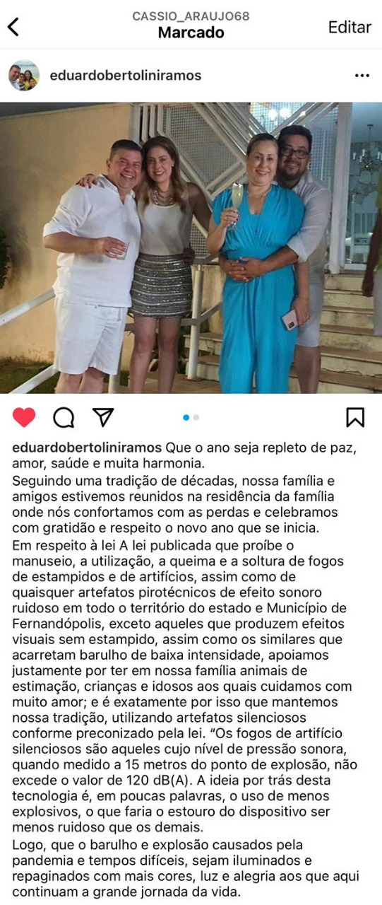 Cunhado de Cássio, Eduardo Bertolini publicou no Instagram uma mensagem enfatizando a tradição familiar de “décadas” em comemorar o ‘Ano Novo’ com fogos de artifício, sendo que neste ano, respeitando o estabelecido pela Lei 5112.