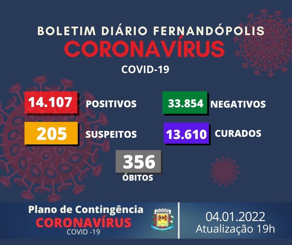 O Boletim Epidemiológico desta terça-feira, 04, registra mais 73 casos positivos para Covid-19 em Fernandópolis. O número preocupa e o município chega a 14.107 infectados.