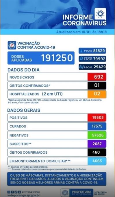 No momento, Votuporanga possui 2 pacientes hospitalizados por coronavírus, ambos em UTI (Unidade de Terapia Intensiva). Ainda de acordo com o boletim, o município contabilizou a 460ª morte nesta segunda-feira, sendo a vítima uma mulher de 60 anos.