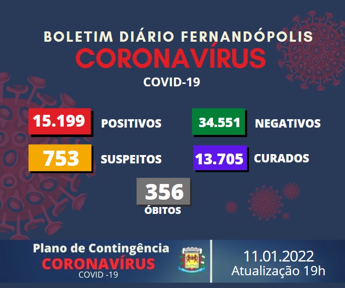O Boletim Epidemiológico desta terça-feira, 11, registrou mais 250 exames positivos para Covid-19 em Fernandópolis. O número de infectados chegou a 15.199, sendo que no momento, 1.138 casos estão ativos no município.