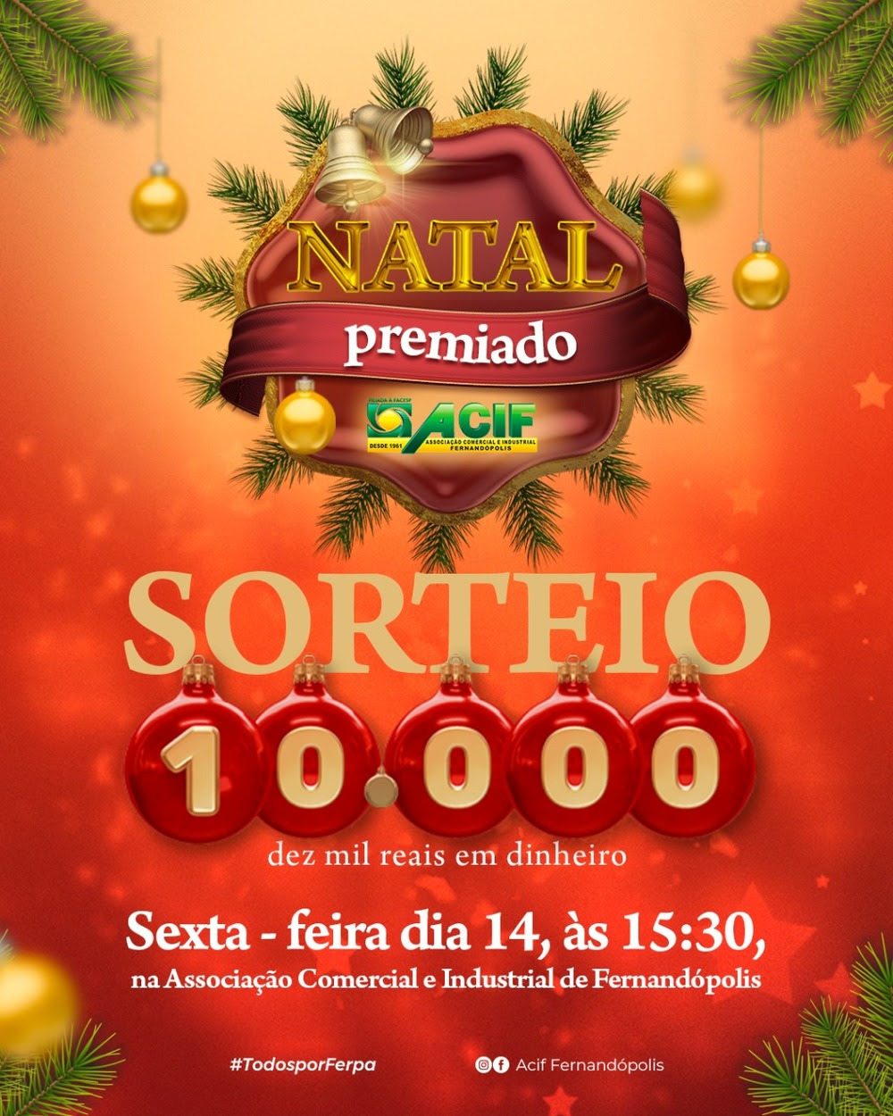 Acompanhe ao vivo pelo Instagram, nesta sexta-feira, 14 de janeiro, às 15h30, direto da ACIF, o sorteio de R$ 10 mil da Promoção Natal Premiado de Fernandópolis.