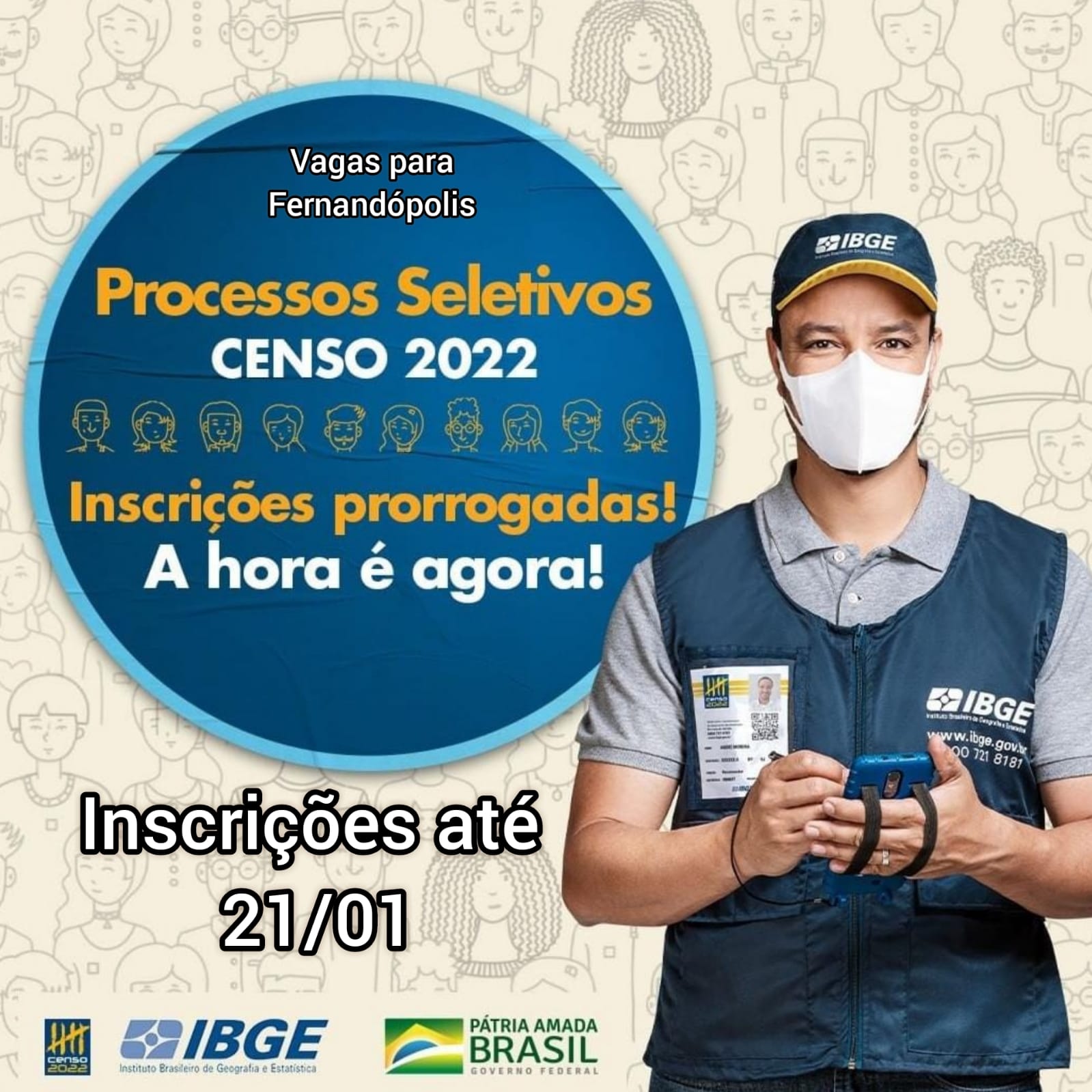 As vagas do agente censitário concorrem Fernandópolis, Meridiano Pedranópolis e São João das Duas Pontes.