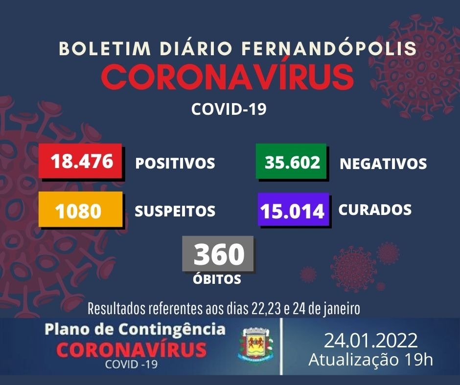 O Boletim Epidemiológico desta segunda-feira, 24, registrou mais 648 exames positivos para Covid-19 em Fernandópolis. O número de infectados chegou a 18.476, sendo que no momento, 3.102 casos estão ativos no município.