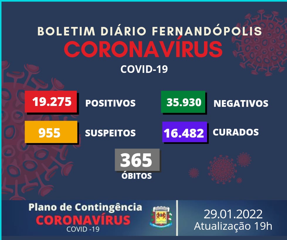 O Boletim Epidemiológico deste sábado, 29, registrou mais 162 exames positivos para Covid-19 em Fernandópolis. O número de infectados chegou a 19.275.