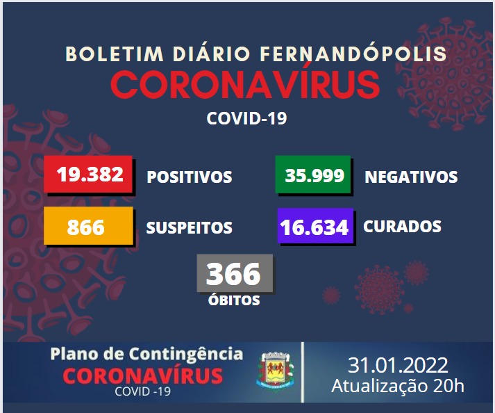 O Boletim Epidemiológico desta segunda-feira, 31, registra mais 107 casos positivos para Covid-19 em Fernandópolis. O número chega a 19.382 infectados desde o início da pandemia.