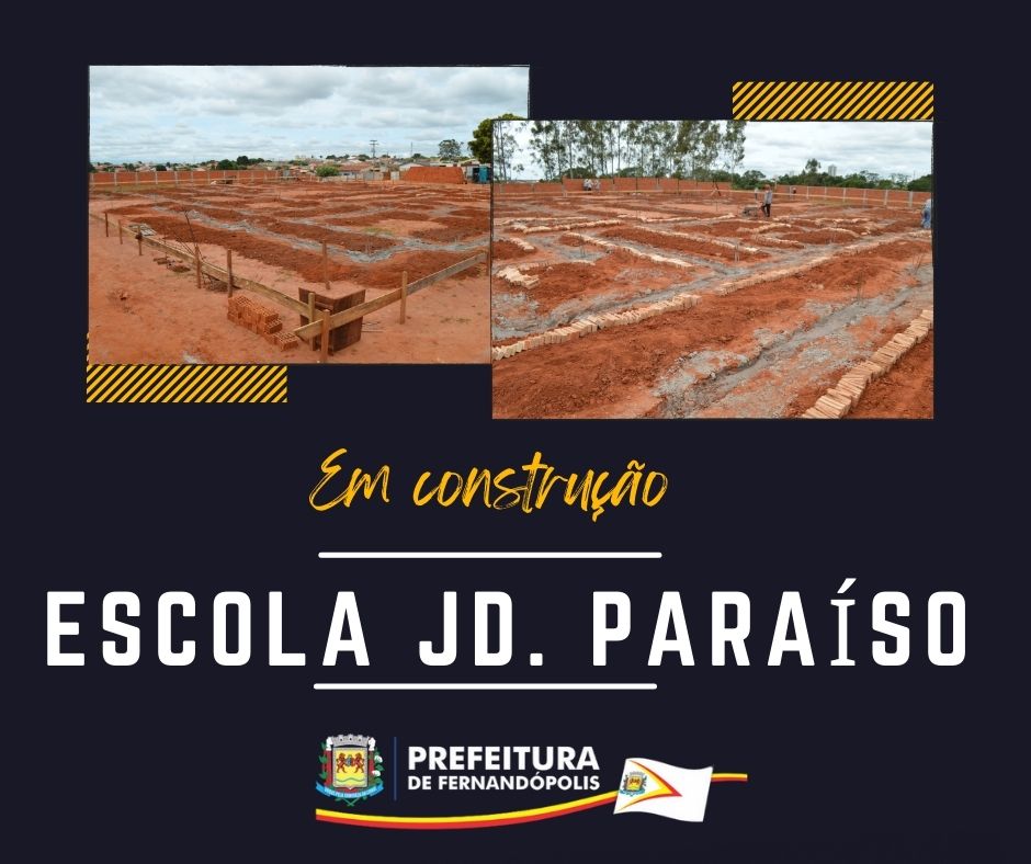 As obras da nova escola municipal no Jardim Paraíso já estão em andamento sendo realizadas pela empreiteira FBR projetos e construções, numa área de 1.575m², com 775,82m² de construção. Uma obra orçada em R$ 2.173.106,62.