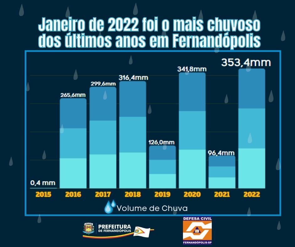Com o acumulado de 353,4mm, janeiro de 2022 superou o mesmo período de 2020 que até então havia sido o mais chuvoso com a marca de 341,8mm. O recorde do mês foi registrado no último domingo, 30, quando o sistema pluviométrico do CEMADEN registrou 108mm de chuva em apenas 12 horas em Fernandópolis.