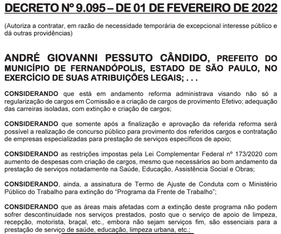 Na última terça-feira, dia 1º, a Prefeitura de Fernandópolis publicou decreto, no Diário Oficial Eletrônico, que autoriza a contratação emergencial de servidores por conta do fim da Frente de Trabalho.