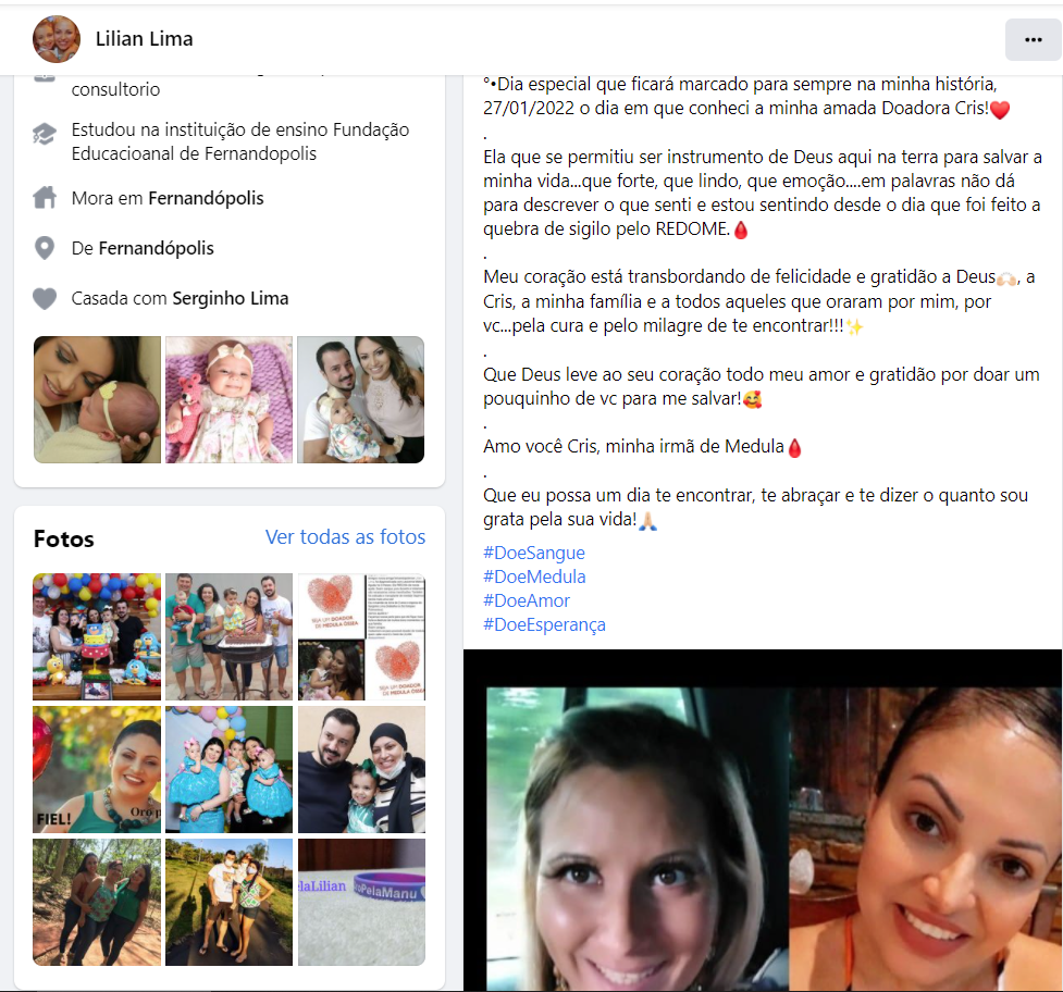 “Dia especial que ficará marcado para sempre na minha história, 27/01/2022 o dia em que conheci a minha amada doadora Cris. Ela que se permitiu ser instrumento de Deus aqui na terra para salvar a minha vida...que forte, que lindo, que emoção....em palavras não dá para descrever o que senti e estou sentindo desde o dia que foi feito a quebra de sigilo pelo Redome. Meu coração está transbordando de felicidade e gratidão a Deus, a Cris, a minha família e a todos aqueles que oraram por mim, por vc...pela cura e pelo milagre de te encontrar!!! Que Deus leve ao seu coração todo meu amor e gratidão por doar um pouquinho de você para me salvar! Amo você, Cris, minha irmã de Medula. Que eu possa um dia te encontrar, te abraçar e te dizer o quanto sou grata pela sua vida!”, descreveu Lilian, nas redes sociais.
