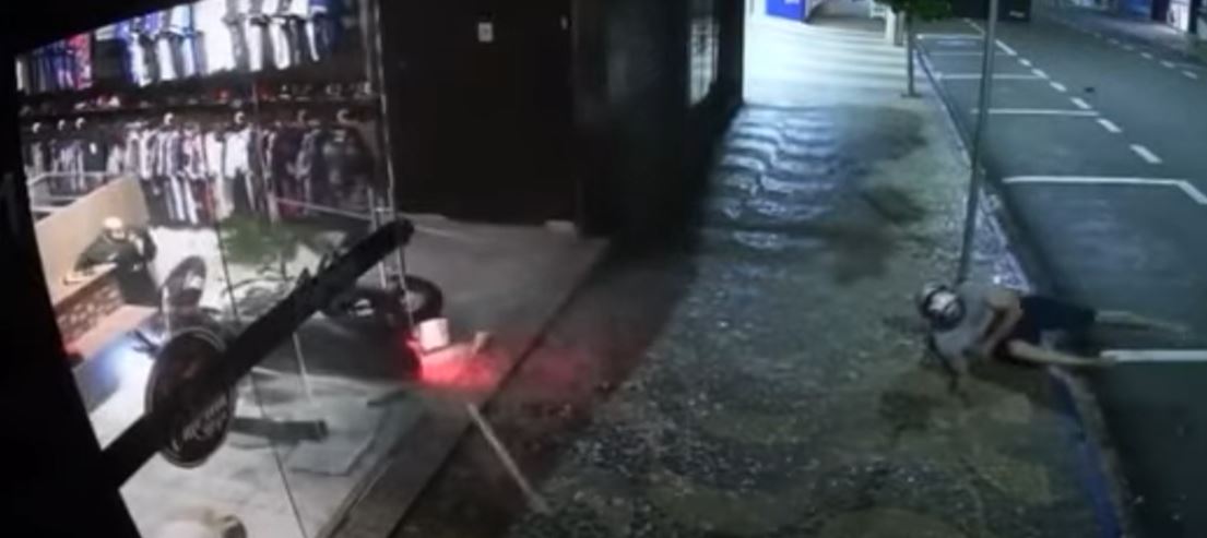 Nas imagens que circulam na internet, é possível ver um motociclista perdendo o controle da moto após empinar a roda dianteira do veículo, e caindo em seguida. Com a queda, a motocicleta foi parar dentro da loja, atravessando e destruindo a vidraça do estabelecimento.