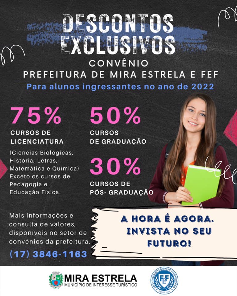 Para este ano, o convênio entre a Prefeitura de Mira Estrela e a FEF – Fundação Educacional de Fernandópolis vai conceder descontos especiais para os munícipes que ingressarem nos cursos de Graduação no primeiro semestre de 2022.