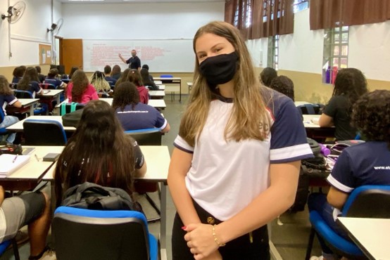 Aos 14 anos, a estudante Júlia da Matta iniciou uma nova fase ao ingressar no primeiro ano do curso técnico de Design de Interiores integrado ao Ensino Médio (Novotec/M-Tec), na Etec José Martimiano da Silva, de Ribeirão Preto. As atividades estão em modo 100% presencial na unidade desde o dia 3 e a aluna conta que, neste período, já conseguiu se familiarizar com o curso e a turma. "Fui muito bem acolhida pelos professores e estou bastante feliz com as novas amizades. Tenho certeza de que no ambiente remoto não seria a mesma coisa. Realmente é mais fácil estudar, entender a matéria e tirar dúvidas quando estamos na escola", diz.