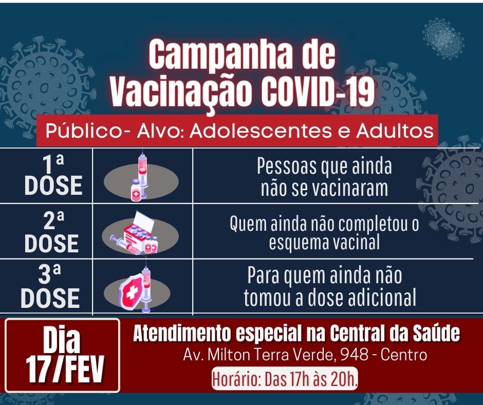 A ação acontecerá das 17h às 20h na Central da Saúde, na Avenida Milton Terra Verdi - 948, centro. Na oportunidade, serão imunizados adolescentes e adultos, sendo aplicadas: primeira dose para quem ainda não foi vacinado, segunda dose para os faltosos e a terceira dose para quem já estiver apto a tomar.