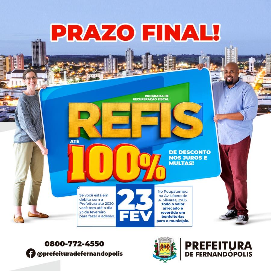 Faltando apenas alguns dias para o encerramento do Programa de Recuperação Fiscal – REFIS da Prefeitura de Fernandópolis, os contribuintes que possuem dívidas até 2020 com município deverão comparecer ao setor da Prefeitura no Poupatempo até a próxima quarta-feira, dia 23, em horário comercial.