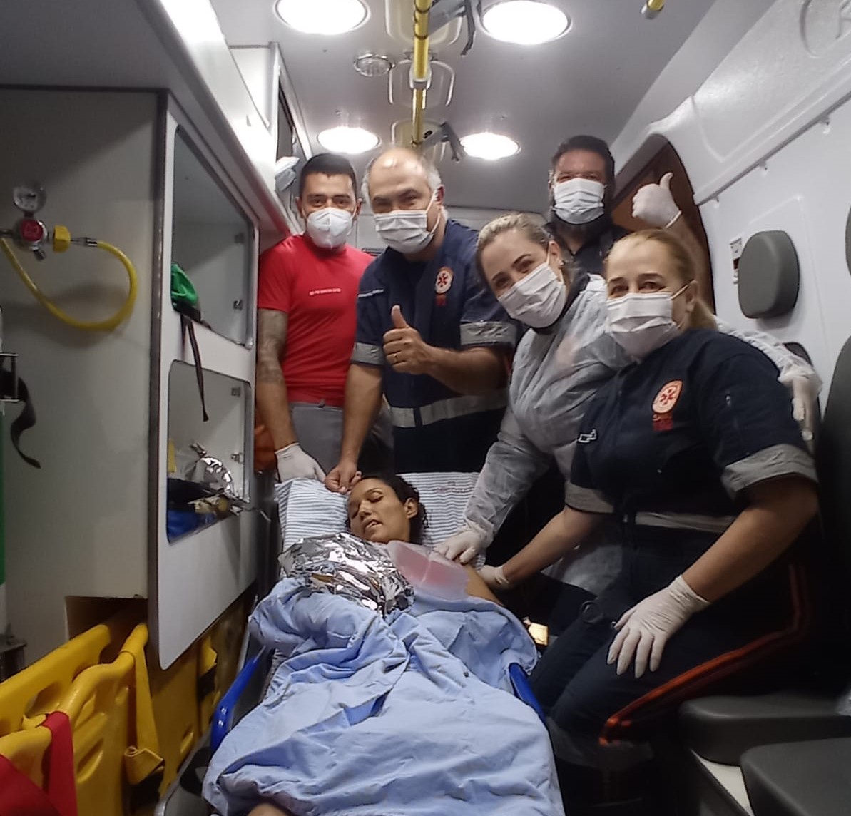 Mãe, recém-nascido e socorristas do SAMU de Fernandópolis