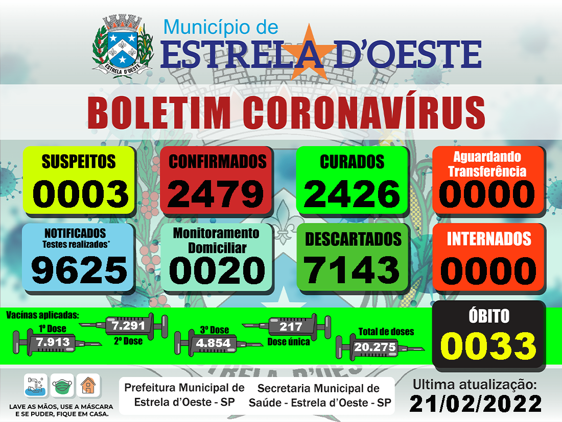 Estrela d´Oeste, município localizado a 17 quilômetros de Fernandópolis, registrou mais casos positivos de coronavírus (Covid-19), nesta segunda-feira, dia 21, de acordo com o boletim epidemiológico, divulgado pela Prefeitura.
