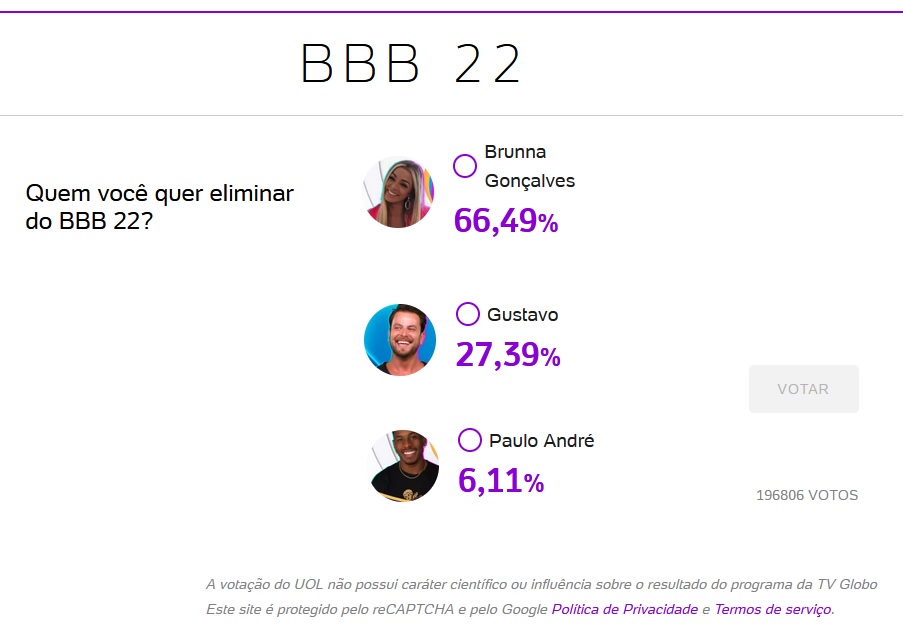 Enquete no Portal UOL indicava, às 16h desta terça (22), a sister Brunna Gonçalves como a próxima eliminada do BBB 22.