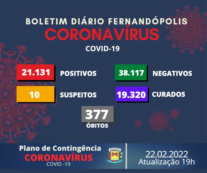 O Boletim Epidemiológico desta terça-feira, 22, registra mais 65 casos positivos para Covid-19 em Fernandópolis. O número chega a 21.131 infectados desde o início da pandemia.