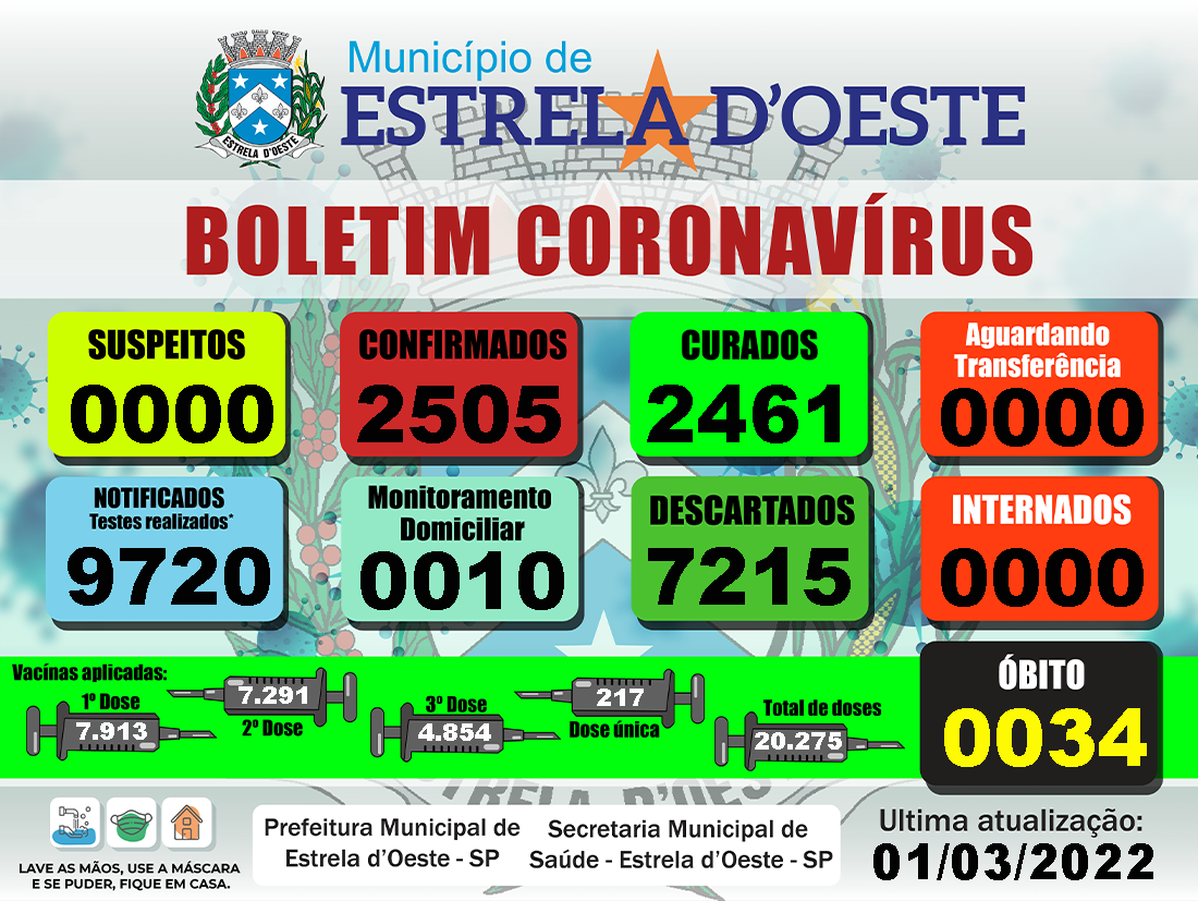 Estrela d´Oeste, município localizado a 17 quilômetros de Fernandópolis, registrou mais casos positivos de coronavírus (Covid-19), nesta terça-feira, dia 1°, de acordo com o boletim epidemiológico, divulgado pela Prefeitura.