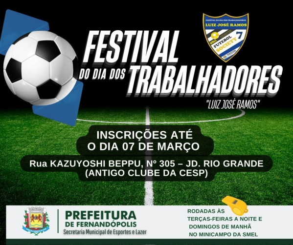 Em vigor desde o dia 18 de fevereiro, as inscrições para o torneio de futebol society Festival do Dia do Trabalhador - Luiz José Ramos, seguem até o próximo dia 7 de março.