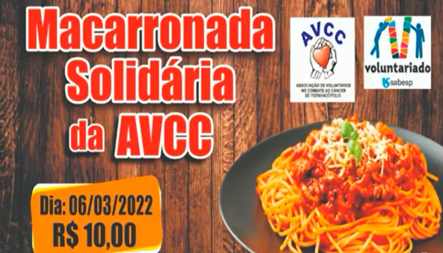 Neste domingo, dia 6, a AVCC (Associação dos Voluntários no Combate ao Câncer) promove a Macarronada Solidária e o Frango Assado da AVCC. A retirada será realizada no Salão Paroquial da Aparecida das 11h às 15h.