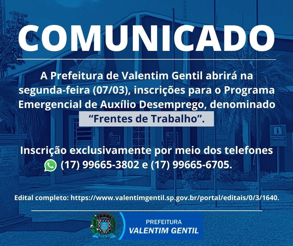 A Prefeitura de Valentim Gentil, por meio da Secretaria Municipal de Assistência e Desenvolvimento Social, abrirá na próxima segunda-feira (07/03), inscrições para o Programa Emergencial de Auxílio Desemprego, denominado “Frentes de Trabalho”. De caráter social, o objetivo desta ação é de proporcionar ocupação, qualificação profissional e renda às pessoas em situação de vulnerabilidade econômica e social. O Programa é mantido com recursos próprios.