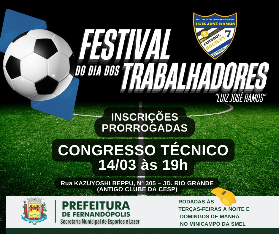 A SMEL – Secretaria Municipal de Esportes e Lazer da Prefeitura de Fernandópolis informa que as inscrições para o tradicional torneio de futebol society ‘Luiz José Ramos’, popularmente conhecida como ‘Festival do Dia dos Trabalhadores’, teve suas inscrições prorrogadas por mais uma semana.
