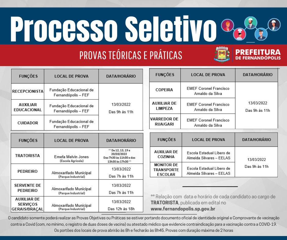 Está em andamento na Prefeitura de Fernandópolis o processo seletivo para contratação temporária. A aplicação das provas práticas para algumas funções e teóricas acontecerão a partir do próximo final de semana em diferentes localidades.
