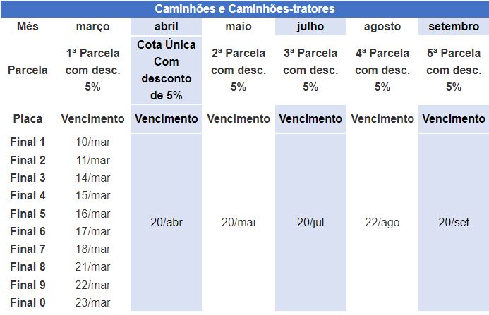 O ciclo de vencimento do IPVA 2022 para esta categoria se difere das demais. Ainda na sexta-feira, 11, vence o prazo para o pagamento da primeira parcela com desconto de 5% para caminhões e caminhões-tratores com placas com o final 2 (confira as demais datas na tabela abaixo). O calendário também segue até o dia 23 de março para os veículos com final de placa 0.