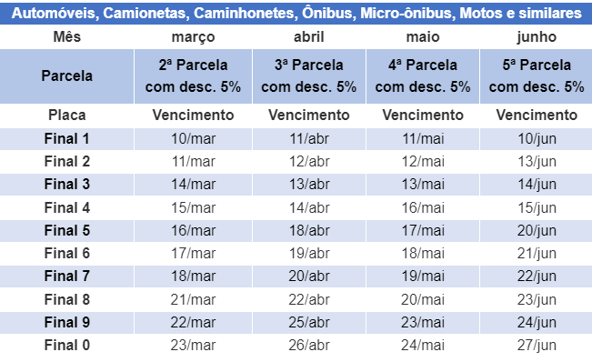 O calendário de vencimento de acordo com o final de placa dos veículos segue até o dia 23 de março, considerando apenas os dias úteis (veja na tabela abaixo). A consulta do valor do imposto pode ser feita em toda a rede bancária ou diretamente no portal da Secretaria da Fazenda e Planejamento.
