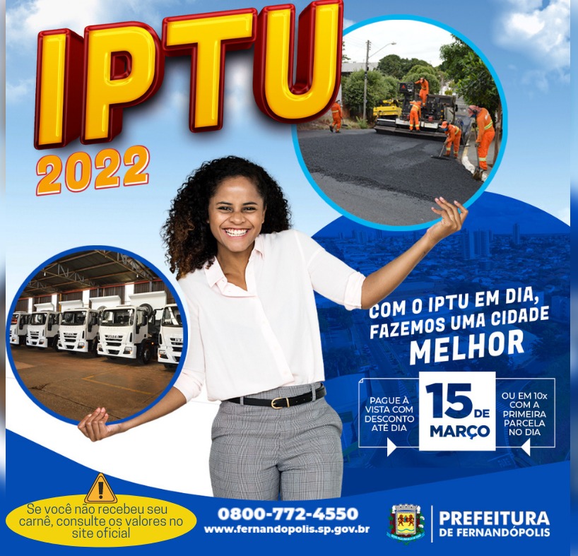 O contribuinte fernandopolense pode pagar seu IPTU (Imposto Predial e Territorial Urbano) 2.022 à vista com desconto até o dia 15 de março, que também é data definida da primeira parcela para quem optar em dividir o imposto em até 10 vezes.