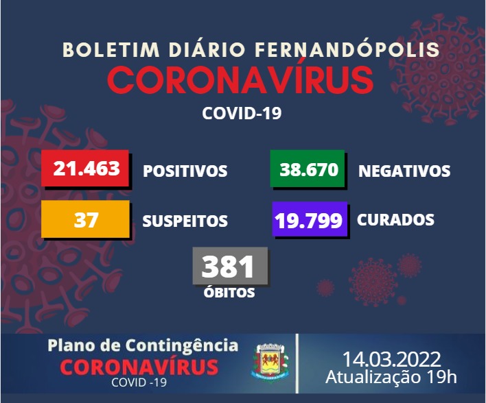 O Boletim Epidemiológico desta segunda-feira, 14, registra mais 5 casos positivos para Covid-19 em Fernandópolis. O número chega a 21.463 infectados desde o início da pandemia.