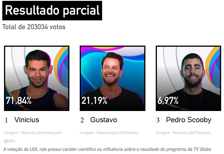 Na primeira posição da enquete do UOL, às 15h30 desta terça (15), Vyni somava 71,84%% dos mais de 203 mil votos registrados na parcial. A vice-liderança era de Gustavo, com 21,19%. Scooby aparecia tranquilão, curtindo sua brisa na praia com somente 6,97% dos votos computados até então.
