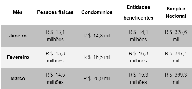 Deste montante, R$ 14,5 milhões são de pessoas físicas que incluíram o CPF na nota em suas compras. Outros R$ 15,3 milhões são destinados a instituições filantrópicas para utilização em seus projetos. A liberação dos créditos de março é referente às compras e doações de documentos fiscais realizadas em novembro de 2021.