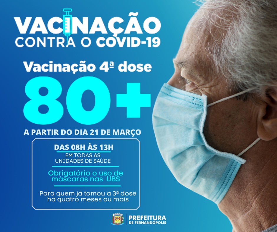 A Secretaria Municipal de Saúde começa a vacinar a partir da próxima segunda-feira, 21, pessoas de 80 anos ou mais com a 4ª dose contra a Covid -19. Poderá receber a vacinação o idoso que tiver tomado a terceira dose há, pelo menos, quatro meses.