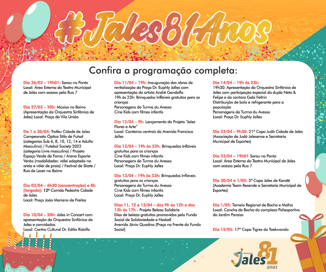 Jales vai comemorar aniversário de 81 anos no próximo dia 15 de abril e quem vai ganhar o presente é a população. Batizada de “Jales 81 Anos”, a extensa programação esportiva e cultural terá início no próximo dia 26 de março e se estende até o mês de maio. Entre as principais atrações estão a inauguração das obras de revitalização da Praça Dr. Euphly Jalles, apresentações da Orquestra Sinfônica, concerto musical, campeonatos e muitas atrações para todas as idades.