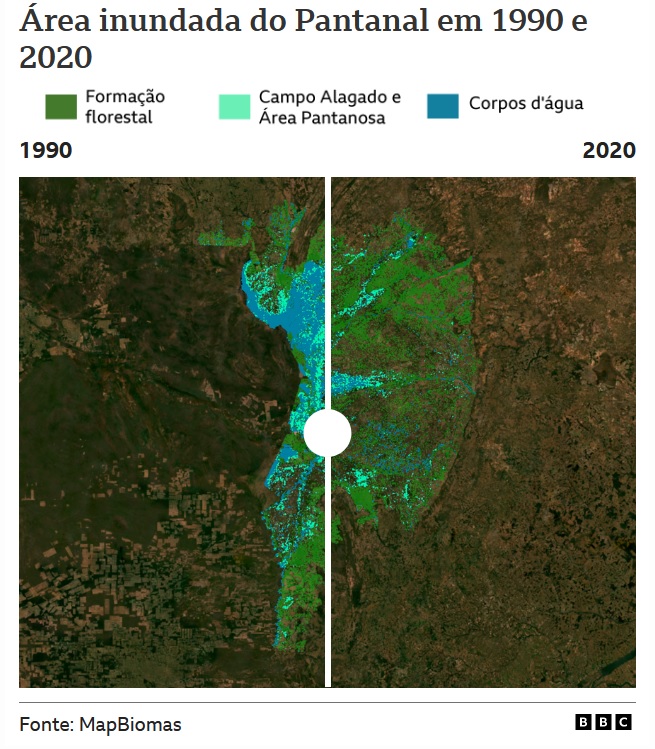 E esses dados mostram que a média histórica da área inundada do Pantanal caiu 26% nos últimos 30 anos.