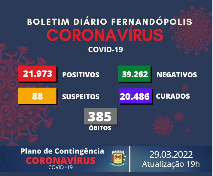 O Boletim Epidemiológico desta terça-feira, 29, registra mais 3 casos positivos para Covid-19 em Fernandópolis. O número chega a 21.973 infectados desde o início da pandemia.