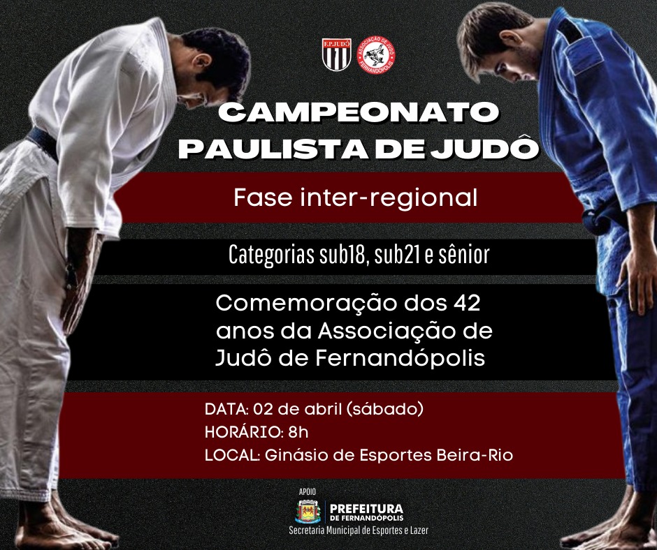 O ginásio de esportes Beira-Rio em Fernandópolis recebe no próximo sábado, 02, a fase inter-regional do Campeonato Paulista de Judô, nas categorias sub18, sub21 e sênior. São esperados judocas de várias cidades da região para participarem do evento que celebrará também os 42 anos da Associação de Judô de Fernandópolis.