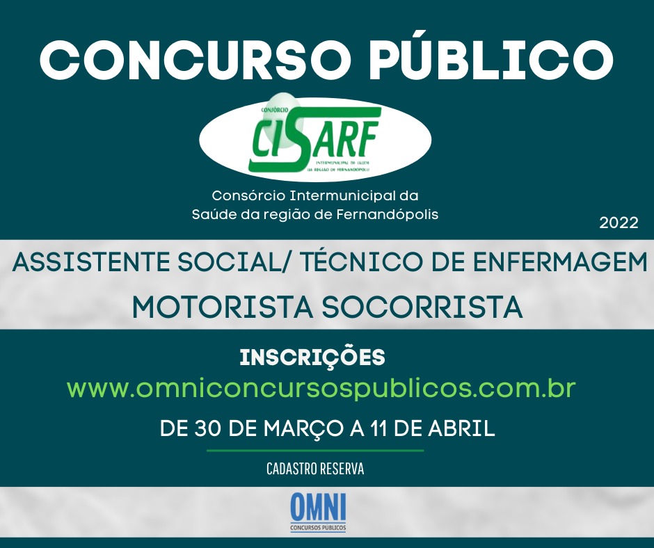 O Consórcio Intermunicipal de Saúde da região de Fernandópolis - CISARF abriu nesta quarta-feira, 30, as inscrições para Concurso Público visando selecionar candidatos para o preenchimento dos cargos de Assistente Social, Motorista/Socorrista e Técnico de Enfermagem em cadastro reserva.